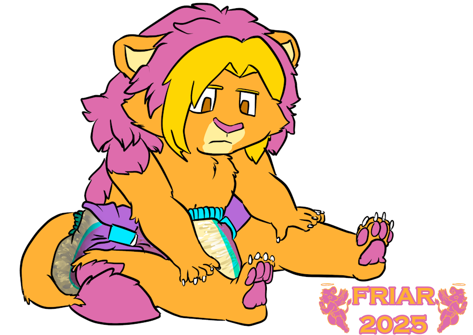 Illustration of Friar the wet and messy diapered lion rubbing his legs while looking somewhat distressed on his new race car bed.