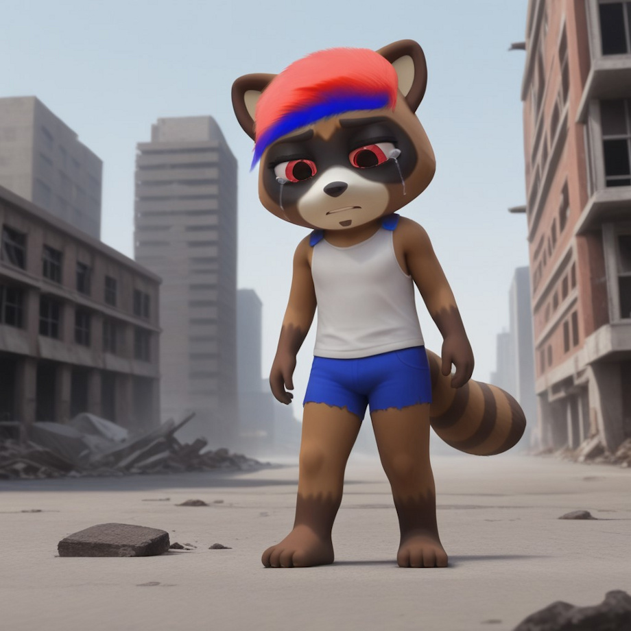 Alex_Rakoon, solo, 1boy, 3d, red eyes, animal ears, blue hair, tail, male focus, multicolored hair, red hair, furry, furry male, raccoon ears, raccoon tail, two-tone fur, sleeveless shirt, short pants, abandoned city, destroyed building, destroyed street, standing, sad, tears, legs closed, crying, tears down, betrayed, looking down