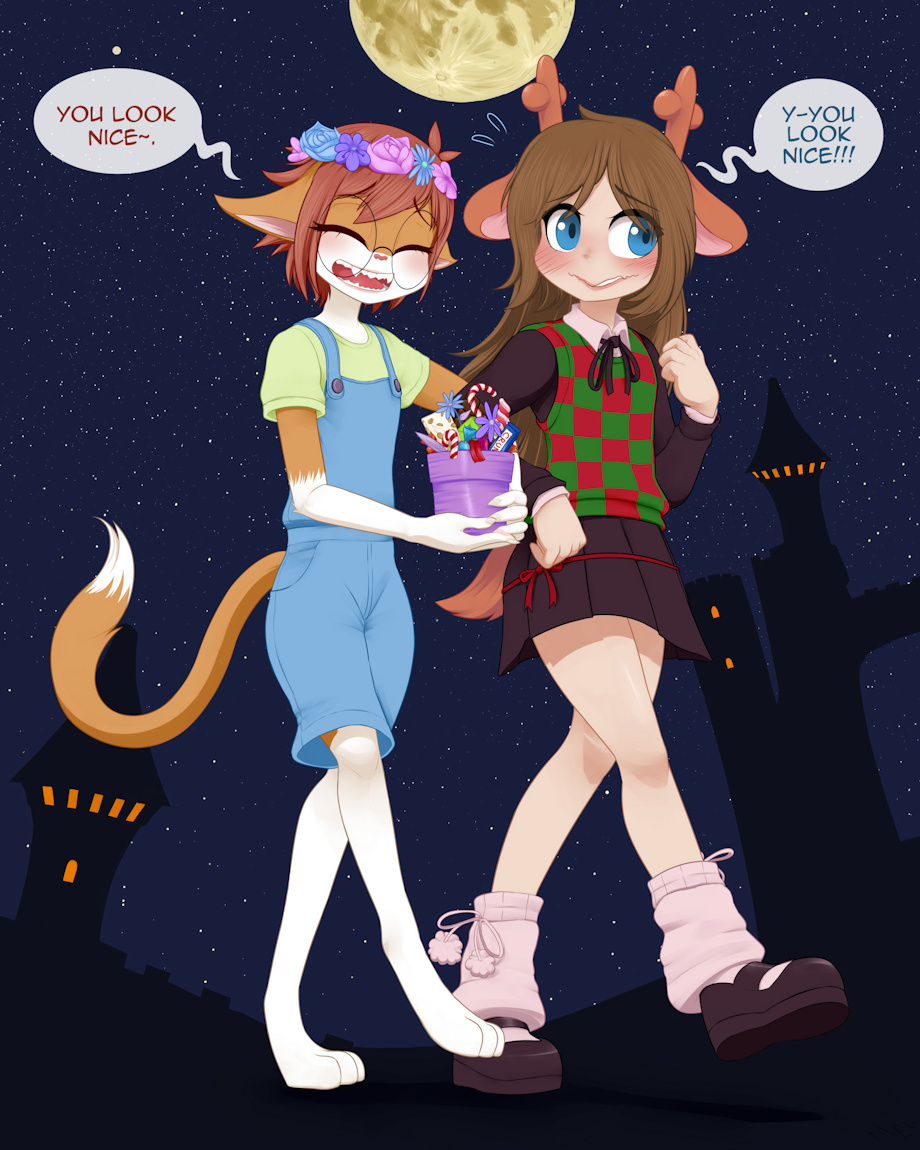 Jesse dressed up as Basil from Omori and James as Noelle from Deltarune, having gone out trick or treating I think, even though they both look rather old for it. But ah, they're having so much blushy trouble telling each other just how cute they are, isn't that just ultra cute in on itself?