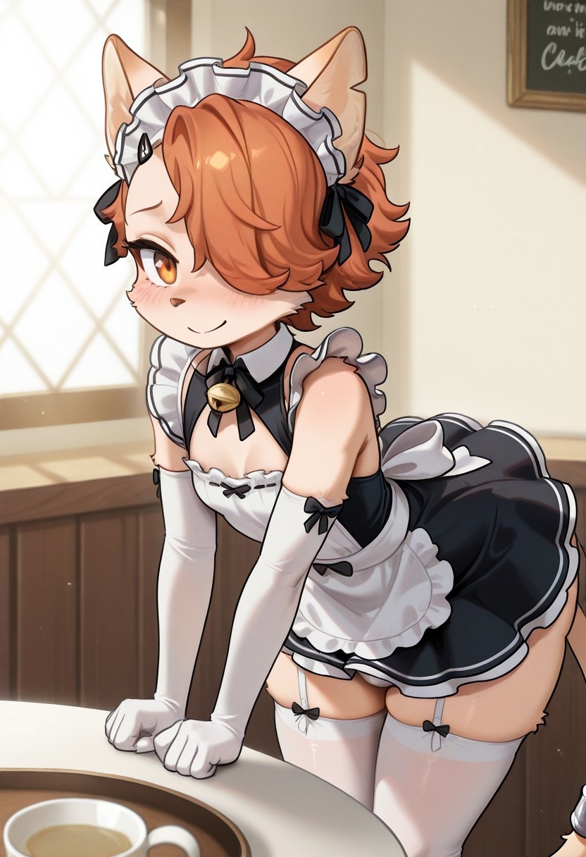 Prompts: solo, kemono, furry, Kyle Bavarois, kemono, furry male, male, cream fur, orange eyes, short hair, orange hair, hair over one eye, animal ears, cat ears, cat tail, tail ring, wide hips, bulge, flat breasts, maid headdress, hairclip, black ribbon, hair ribbon, neck ribbon, neck bell, bell, maid, frills, sleeveless, black dress, white gloves, elbow gloves, maid apron, white apron, thighs, white thighhighs, white garter straps, cafe, daylight, BREAK, looking at viewer, smile, blush, shy, bent over,