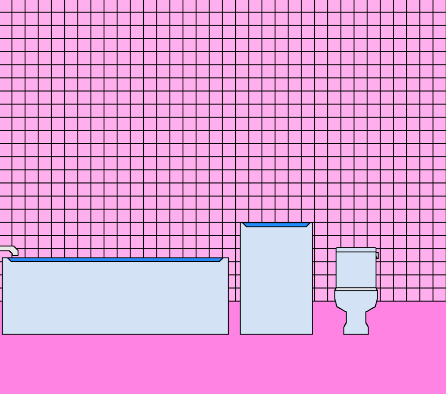 This is Bendt's mom's bathroom, the door on the left is access to the room with a large in-ground bathtub that looks like a Japanese hot spring.