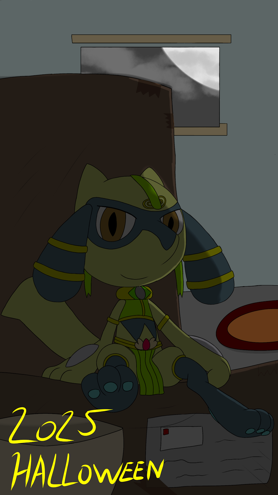 For Halloween 2025, Riki has set up a cardboard box throne and in his own Ruin Style Costume~