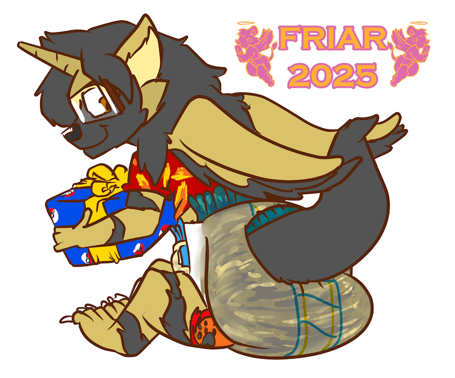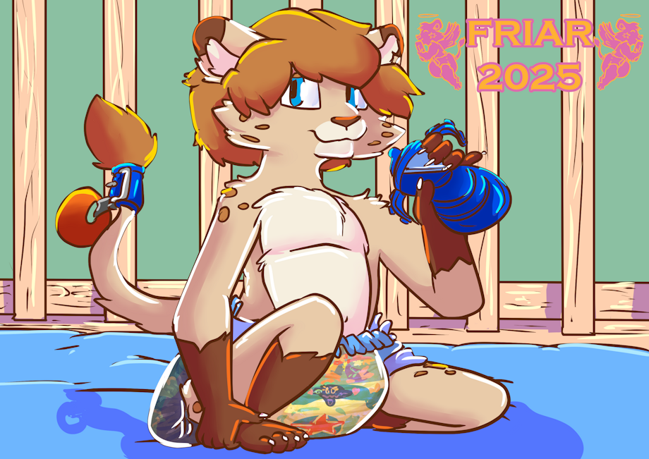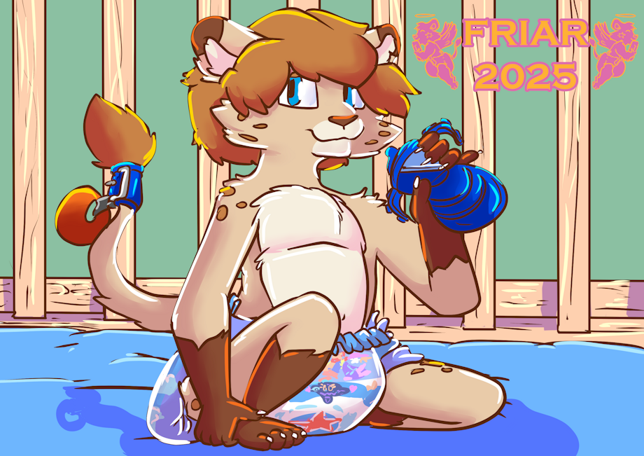 Illustration of Toffee the wet and messy diapered lion sitting on his toddler bed while holding one of his feet and his sippie cup.