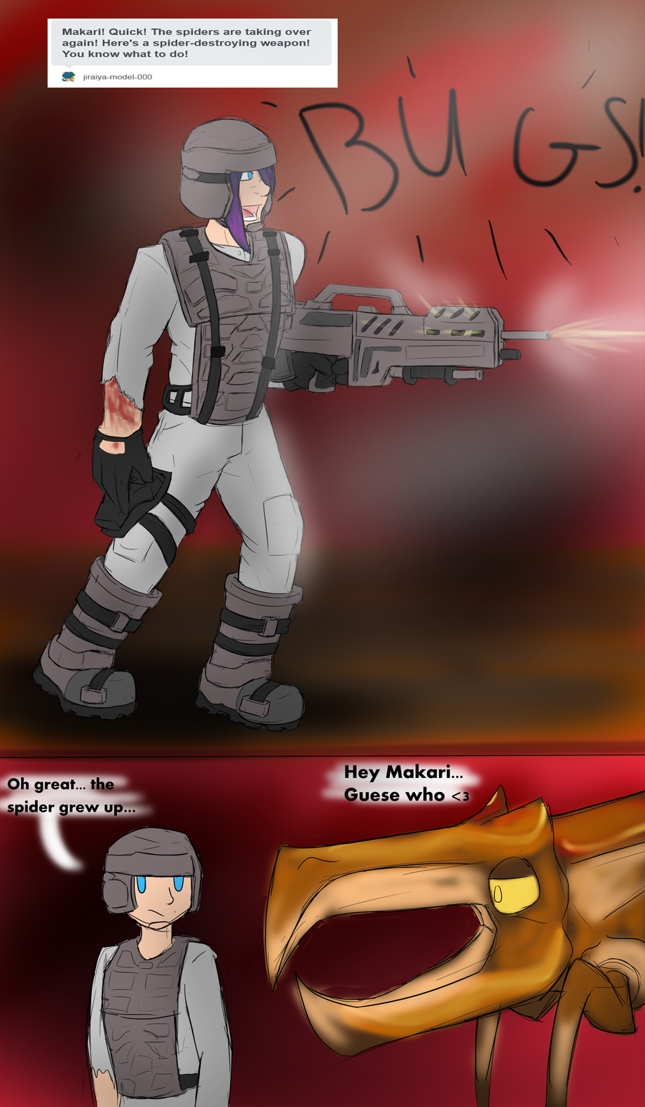 After a long time away the spider has returned... bigger... and in more need of hugs... this was fun to draw i love starship troopers <3