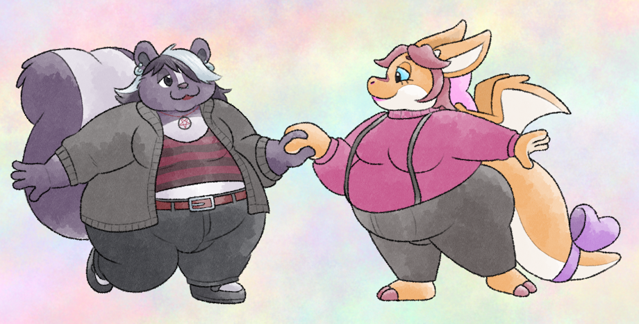 Pairing Picture 2/3 for Riley, with their partner Samael! The skunk and butter dragon holding hands, in their cute outfits! :3 I sketched this one out first, but felt like I wanted something closer and more expressive and intimate, which is how the first of these three pictures came to be!