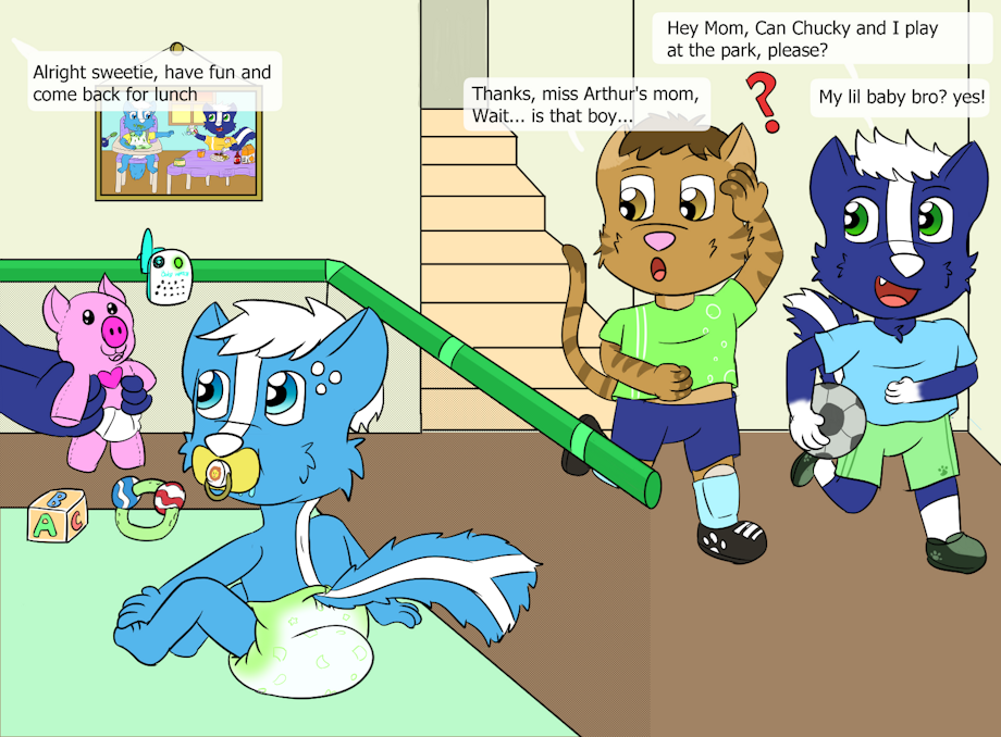 Arthur's firend invited him to play some soccer with them at park, and Arthur went with him to get his favorite ball. When they were about to go. Chucky saw Gus for the first time. It's quite a surprise for him to see someone as big as them, but instead playing soccer or in the same class, being in a playpen, get entertained by his mommy with plushies, with a paci on and in a diaper, and that doesn't look dry...