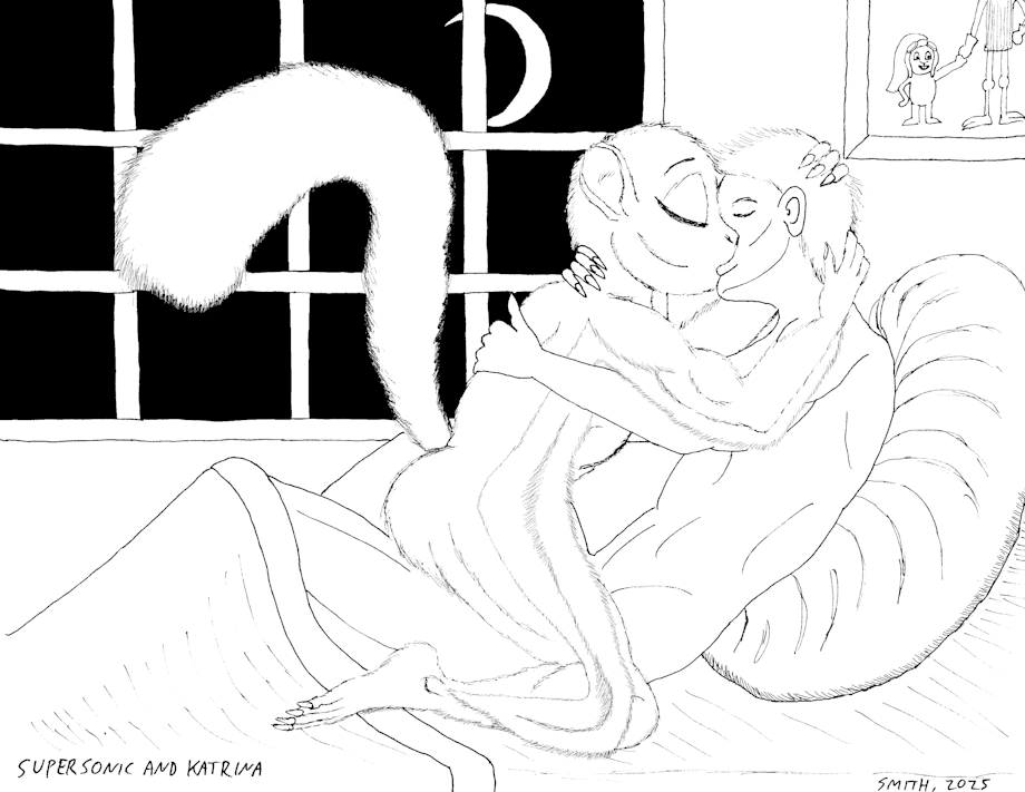 Supersonic Squirrel--a character from a 1960s cartoon magically wished to life, now a superhero who works for the U.S. government--enjoys an intimate moment with Katrina Werner, his human girlfriend.