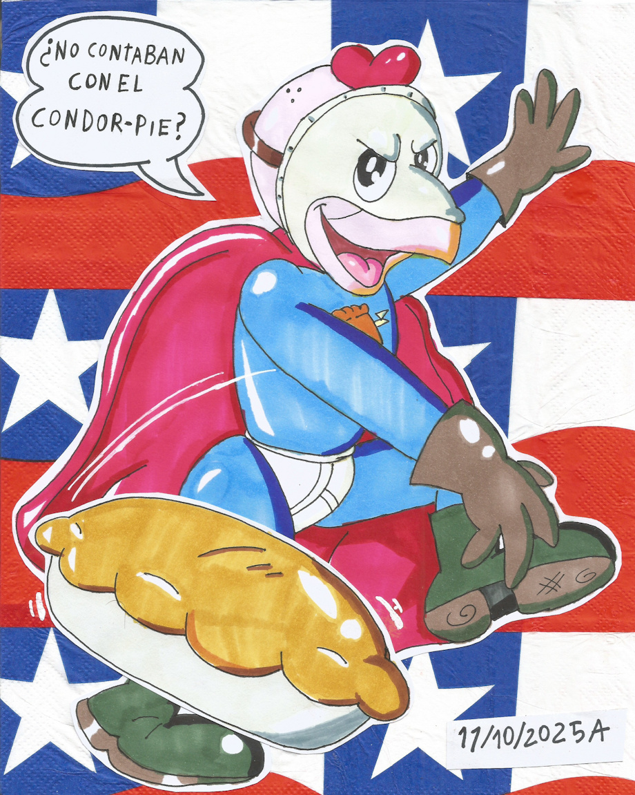 Everyone's editing the Man Pie as an epic superhero, so I'm joining in too, but with the Condorito Captain America cover because it occurred to me at the time (I was going to include Cone as the "Quequito kid" but didn't have enough space). And let's also consider this drawing as a drawing for last September 18th, when I didn't have time to draw anything. Cheers, and keep drawing.