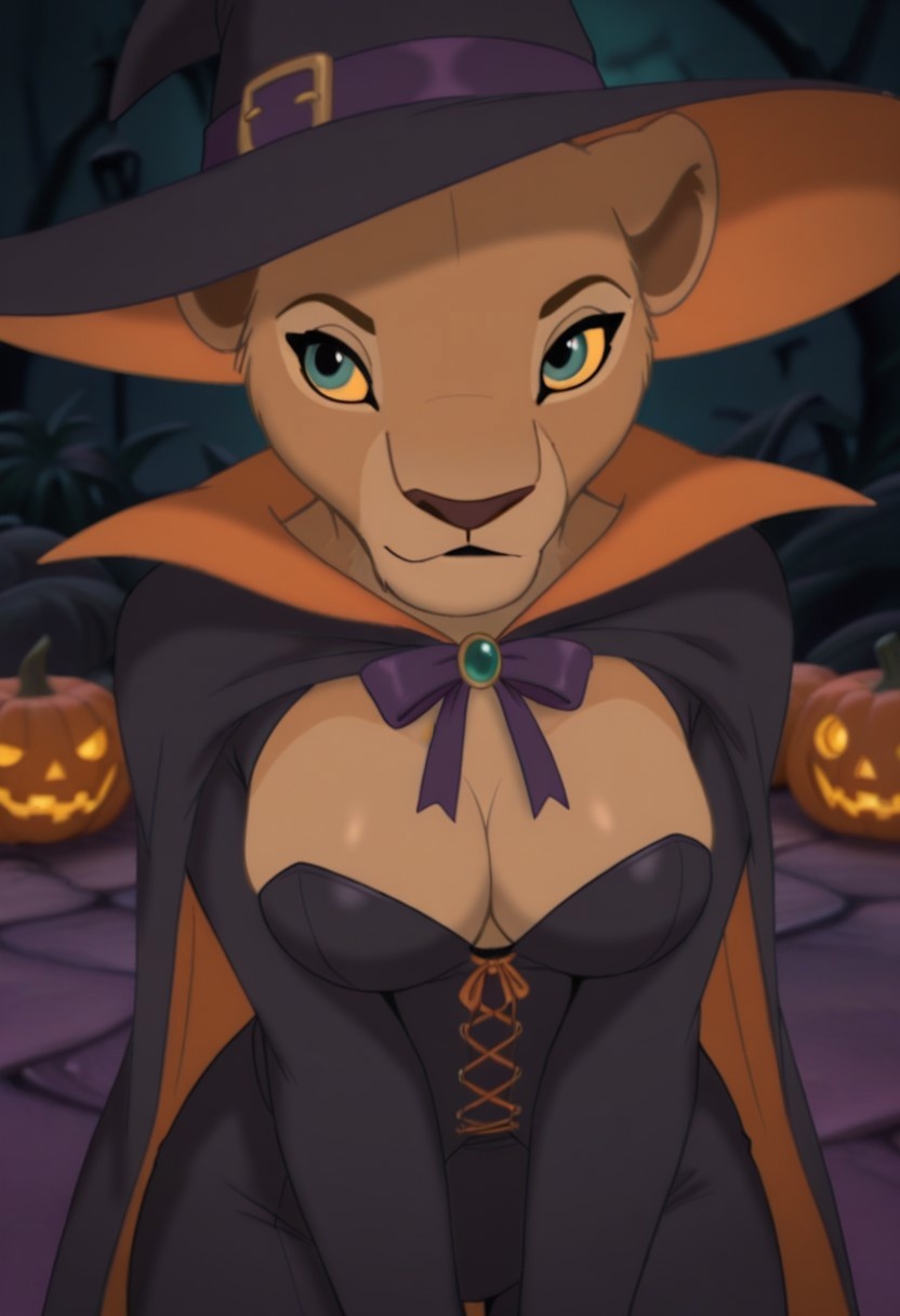 masterpiece, best quality, nala, lion, two tone fur, tan fur, female, yellow sclera, teal eyes, anthro, solo, halloween theme, jack-o-lantern, solo, witch costume, medium breasts