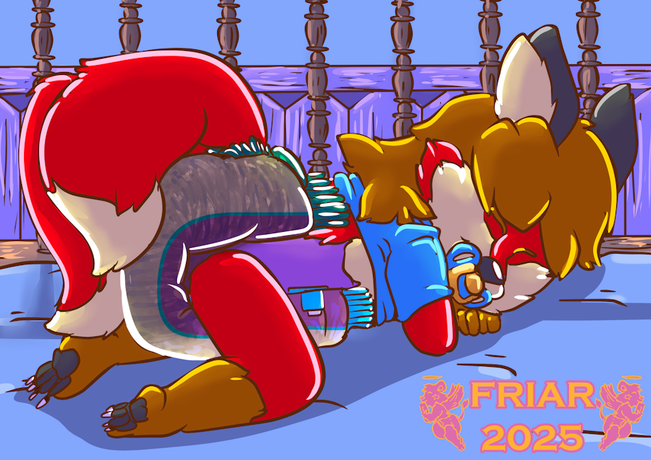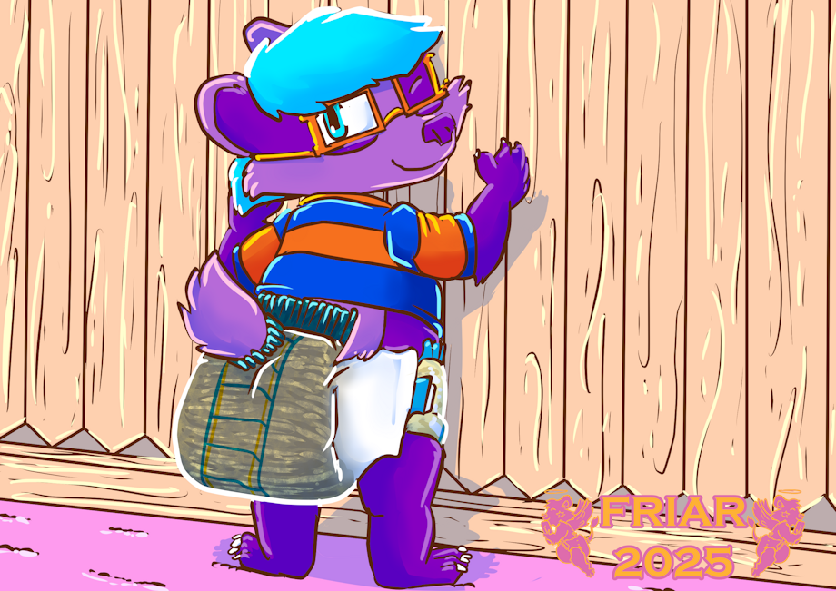 Illustration of Ozzy the wet and messy diapered two tailed fox napping in a crib while sucking a pacifier and looking at peace.