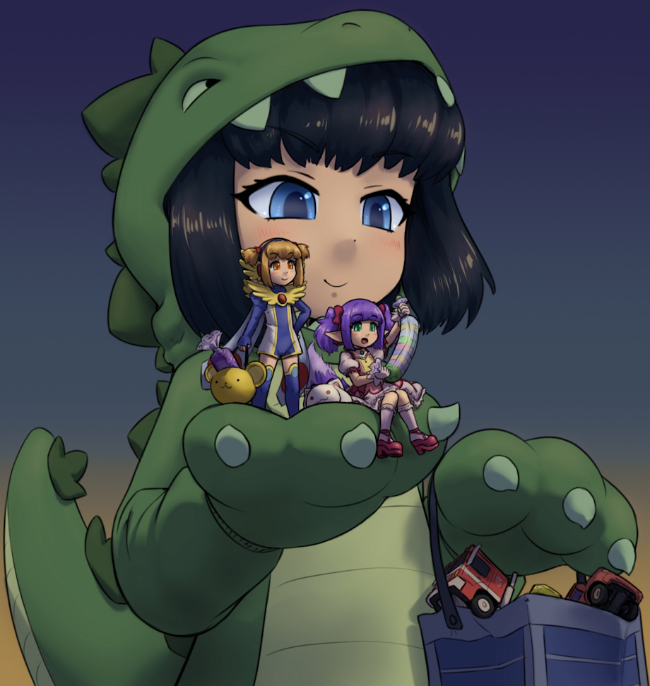 Adorable Halloween picture! Rem in her dorky Godzilla costume and her bag full of model trucks makes for a fun contrast to the tiny Chloe and Flix on her cushy costume palm with their enormous candy! MadokaFlix in awe of her huge Smarties, awwww. Those Kero/Kyubey bags too, hahahaha. Chloe in the Big Sakura costume despite being so small, awwww.
