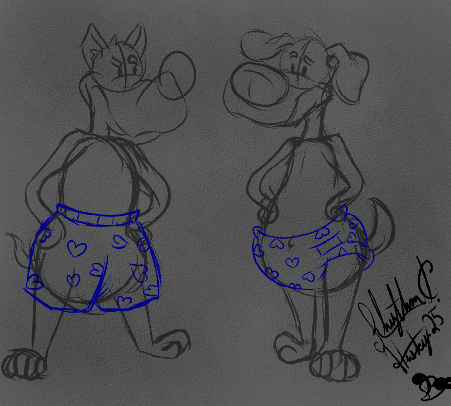 one dog is wear white boxers with red hearts and the other wearing a white diaper with red hearts