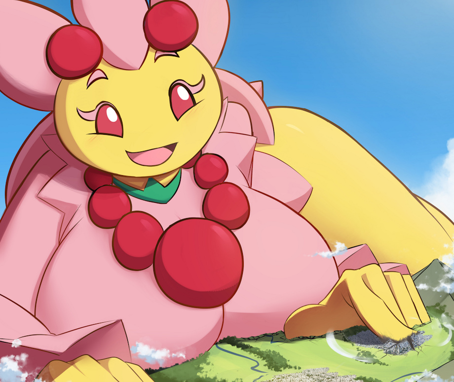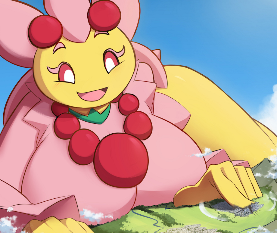 More of Giga chebi, my anthro cherrim OC, laying down, big enough for her breast to match mountain! Crushing some city with her finger playfully~