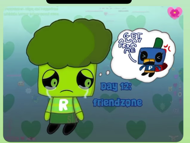 For this day, I decided to make Rokkori, who has feelings for the Peacock student, but every time he tries to pay attention and declare his love, she rejects him 🥦💔 🦚..