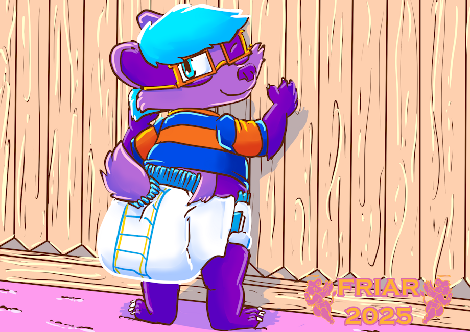 Illustration of Everett the diapered badger pooping his diaper winking at the viewer while pushing off the wall.