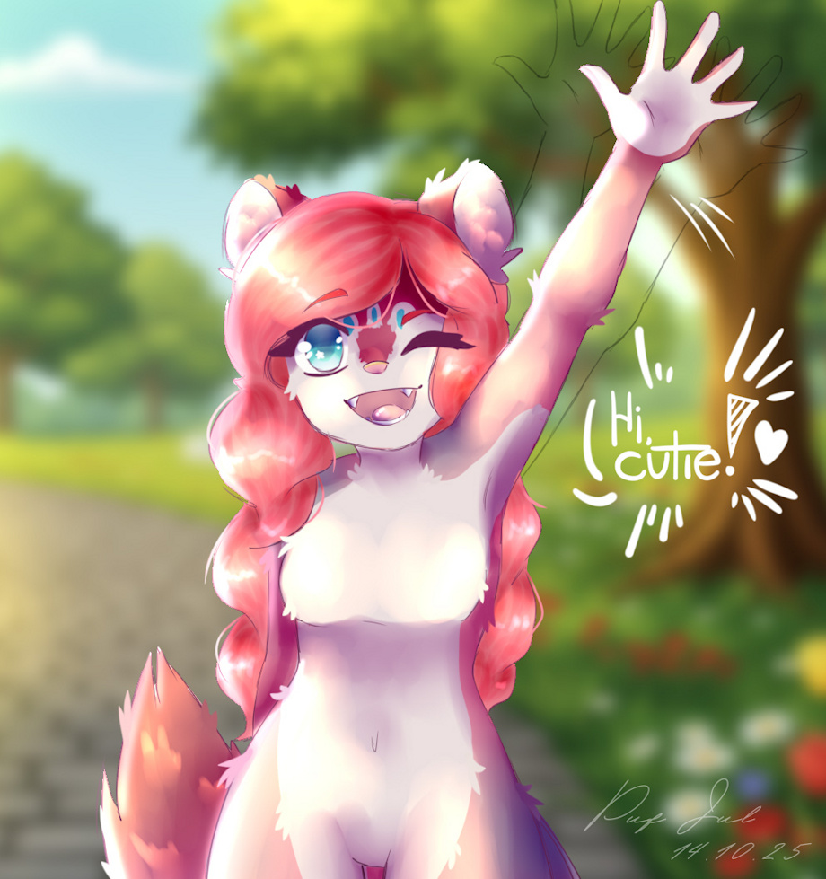 In a green and peaceful forest, a fluffy little flaminko greets you! She beckons you to a campsite where her humble wolfy is roasting buttery chestnuts by the fire.