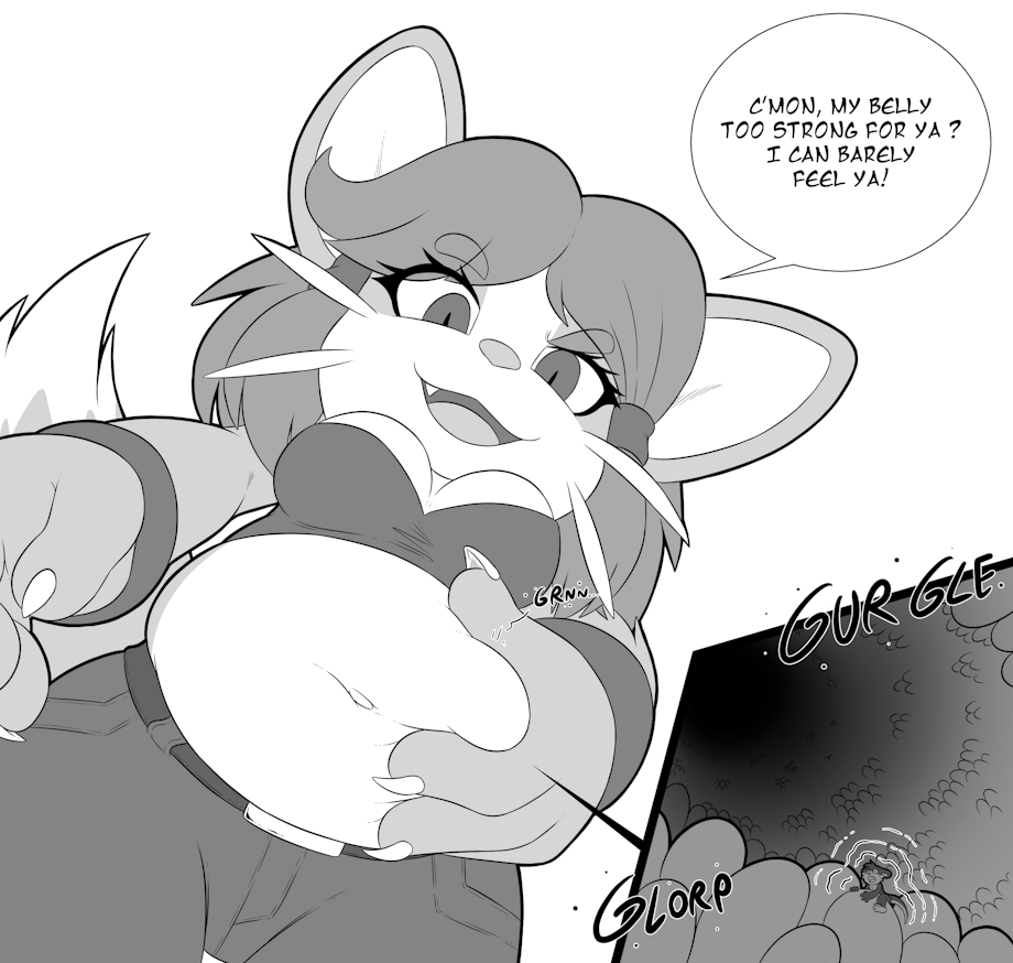 Commish for Eureka Herald, with their Atlyss OC putting a tiny lil snack through quite the quest in her digestive tract uwu shrinking smaller and smaller, even as they go through the little intestine!