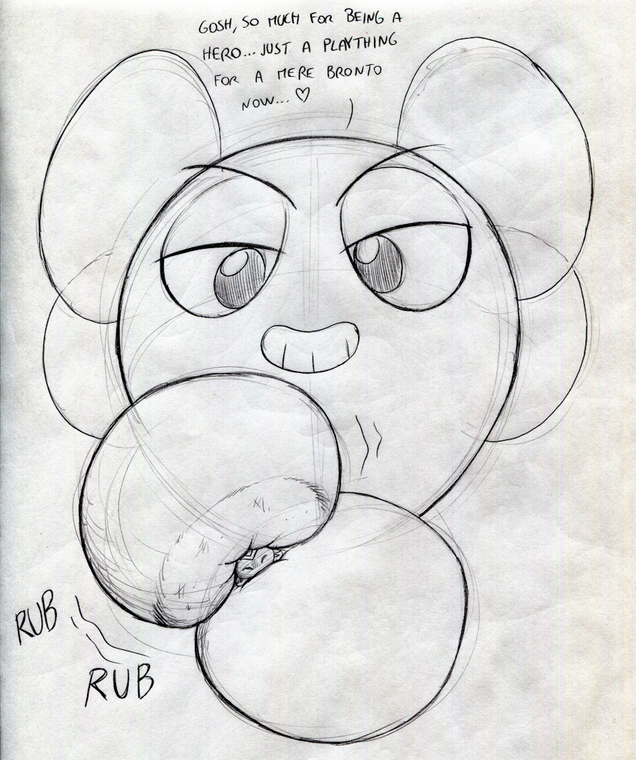 EF sketch for SWTerra. The little orb hero isn't so strong when he's being smothered between two huge pillowy Bronto paws >:3 I love to draw common game enemies in size stuff uwu