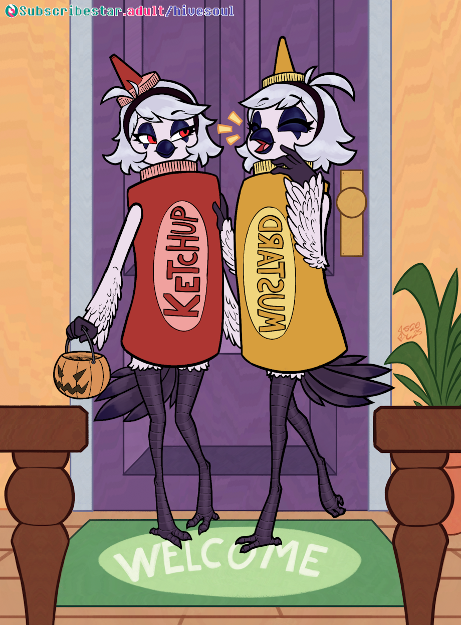 Two silly birds having fun during the spooky season. Something something, footlong special. A commission for a fan of these two. Rybie belongs to VioletEchoes, you can find the ref and some info here. We are also open for comms for next month! Check out the journal here.