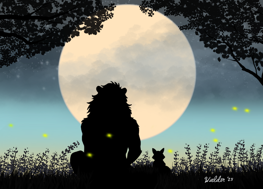 An abstract image. A lion sits in the grass contemplating the night sky while a fox cub sits next to him. The lion protects the innocent life.