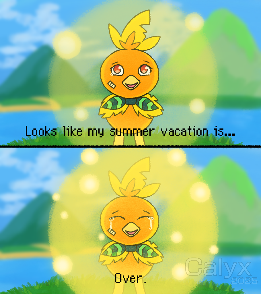 Speaking of, PSMD is a perfect game to play in the summer, considering the a majority of the plot does take place during it! --- Want to see my art before they're uploaded here? See my Bluesky at calyxthefox . bsky. social !