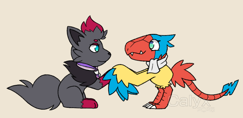 Speaking of, it’s the 5th year anniversary since I truly came up with these two characters! I'm really proud of my art progression by drawing these two from time to time, and I hope to continue drawing them more in the future! --- Want to see my art before they're uploaded here? See my Bluesky at calyxthefox . bsky. social !
