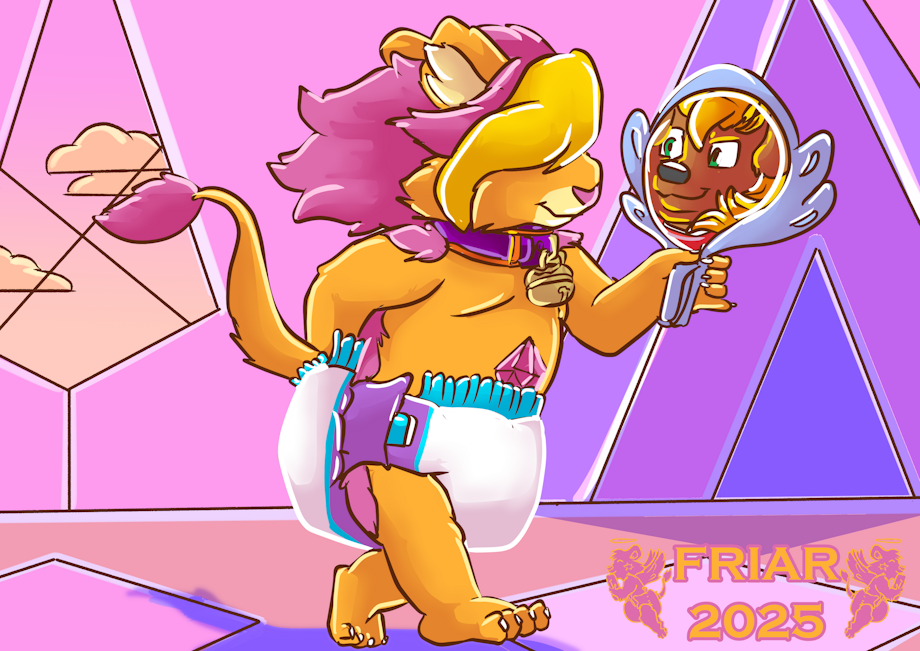 Illustration of Pink Friar the wet and messy diapered hybrid diamond lion gazing into a mirror and seeing SSJ3 Baby Rowlf, an earlier fursona while in the Diamond Tower.