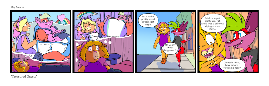 Illustration of Friar the wet and messy diapered lion buckling Berry the wet and messy diapered immobile fatfur fox into a mobility scooter.