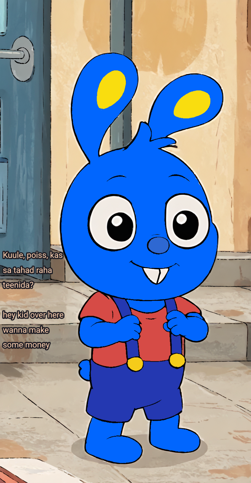 Prompt: High quality, smile, open mouth, shirt, 1boy, rabbit, rabbit ears, electric blue fur, yellow_round_ear_tips, standing, suprised face, suprised, full ligth child, young, blue fur, body, male focus, indoors, yellow_buttions_on_suspenders, suspenders, red t shirt, furry, navy blue overalls, buck teeth lemonade stand in background, outdoors, disembodied hand with a wad of cash, disembodied hand with money, disembodied hand with money, euros, euro cash, €,
