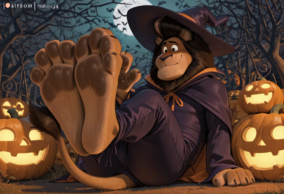 masterpiece, best quality, halloween theme, jack-o-lantern, ((solo)), <lora:Makunga_-_Madagascar_Illustrious:1>, makunga_madagascar, male, tail, tail tuft, mane, witch costume, ((huge feet)), humanoid feet, soles, paw pads