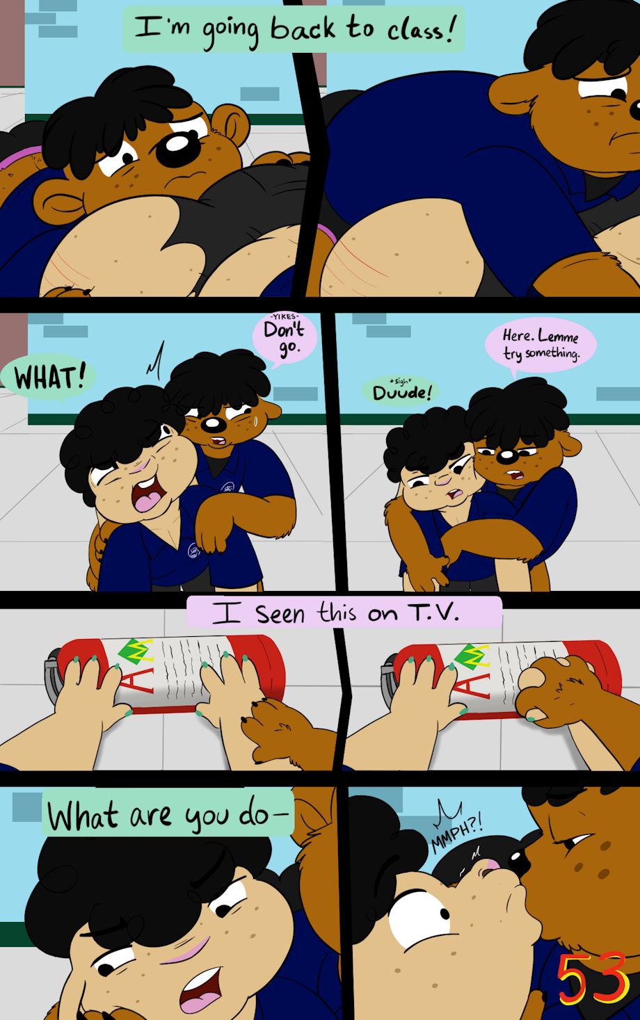 Willie feels guilty for ripping Mike's pants. He gradually moved on top of Mike when Mike yelled, "What!" Willie said, "Yikes, don't go." Willie then reached down to Mike's arm. "Let me try something, I seen this on TV," he said, gently holding Mike's hand. Mike grew more annoyed and started to say, "What are you doing?" but Willie cut him off with a kiss.