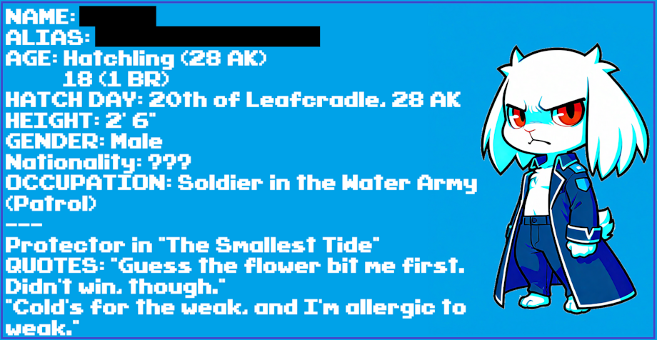 Prompt: masterpiece, best quality, amazing quality, solo, male, (((mimiga))), anthro, (((chibi))), long ears, (((white fur))), red eyes, red nose, red paw pads, open coat, (((blue military longcoat))), shirtless, barefoot, muscles, blue pants, rabbit tail, (((white trim))), warrior, focused, angry expression, arms to side, small mammal, fantasy character, tiny hero, cave story, no hat, (((transparent background))), no hair Negative Prompt: nsfw, bad quality, worst quality, worst detail, sketch, censor, bells on body, jester outfit, open jacket, green shutter shades, graphic on jacket, (((long tail))), red feet, multiple swords, multiple swords Model: illustrious-novafurry Aspect Ratio: portrait LORAs: LORA Strengths: Steps: 30 CFG: 4.5 Seed: 4049620631 |