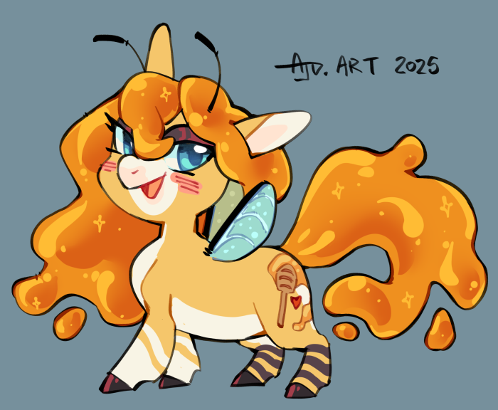 Honeyfae! A very smol fairy-like pony who doesn't actually live in Cloverly but near it in a magical forest. She's very charming and has those "good neighbor" vibes down pat. She loves to make deals with the bigger folk, but only if it's in her favor.