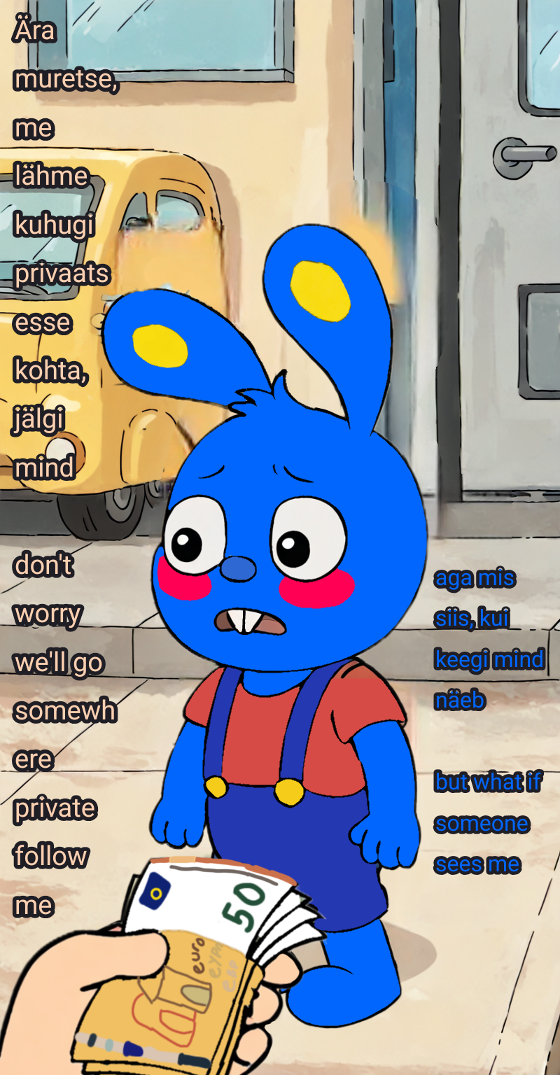 Pic 1 Prompt: High quality, frown, open mouth, shirt, 1boy, rabbit, rabbit ears, electric blue fur, yellow_round_ear_tips, standing, embarrassed face, suprised eyes, embarrssed, full ligth child, young, blue fur, body, male focus, indoors, head turn, looking around, turning head, looking at one direction yellow_buttions_on_suspenders, suspenders, red t shirt, furry, navy blue overalls, buck teeth lemonade stand in background, outdoors, disembodied hand with a wad of cash, disembodied hand with money, disembodied hand with money, euros, euro cash, €,