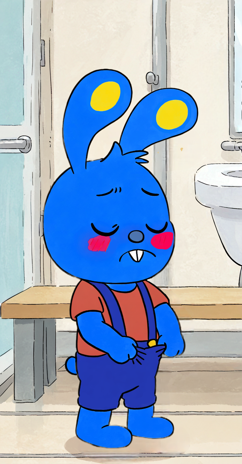 Pic 4 Prompt: High quality, frown, shirt, 1boy, rabbit, rabbit ears, full body, electric blue fur, eyes closed, breathing out, signing, yellow_round_ear_tips, standing behind a bathroom, embarrassed face, embarrssed, full ligth child, young, blue fur, body, male focus, indoors, , looking at one direction hands on suspenders, pulling on suspenders, pulling_on,suspenders, undoing suspenders, red t shirt, furry, navy blue overalls, buck teeth bathroom bathroom background, background, bench, ,