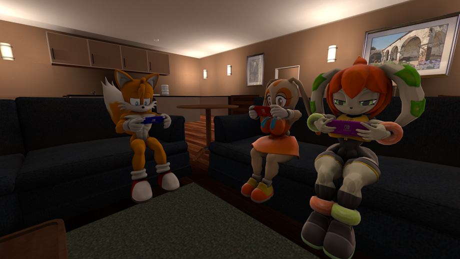 Tails, Cream, and Milla are playing their Nintingo Switch.