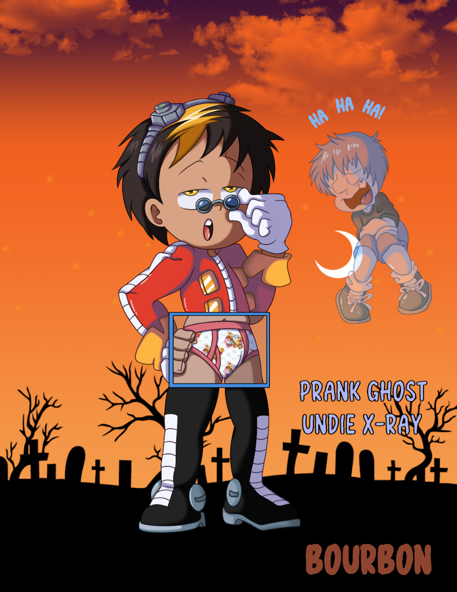 There's a nice line up of kids he's gotta prank this year. So, why not give them all a nice little window to their humiliation? They've got cool costumes on but this ghost is gonna make sure his selected targets are seen in most of their costumes... and their underwear. Because that's just funny.