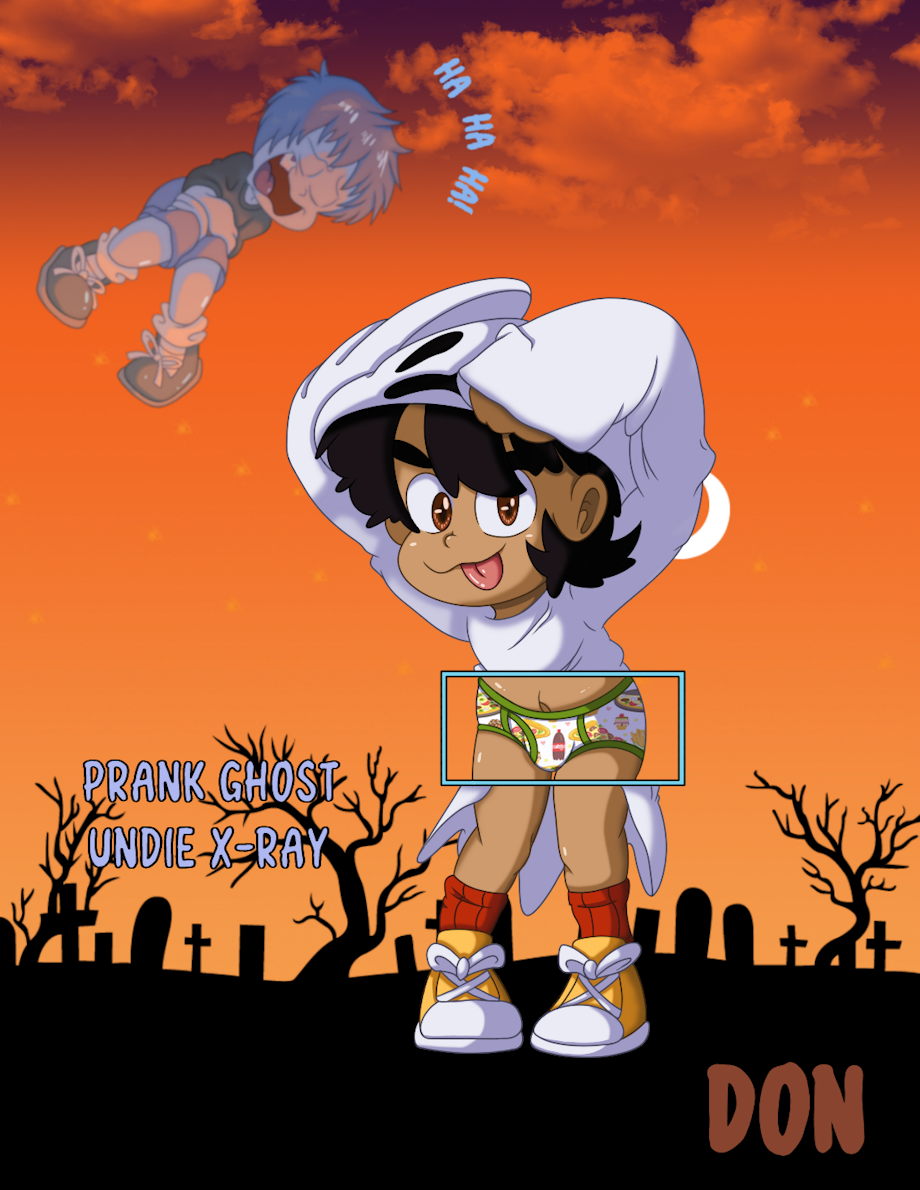 There's a nice line up of kids he's gotta prank this year. So, why not give them all a nice little window to their humiliation? They've got cool costumes on but this ghost is gonna make sure his selected targets are seen in most of their costumes... and their underwear. Because that's just funny.