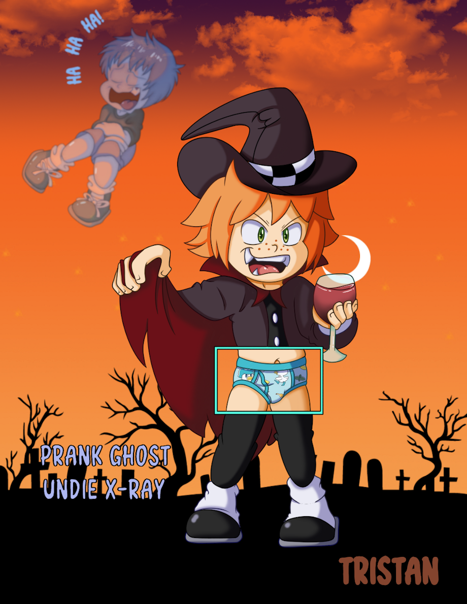 There's a nice line up of kids he's gotta prank this year. So, why not give them all a nice little window to their humiliation? They've got cool costumes on but this ghost is gonna make sure his selected targets are seen in most of their costumes... and their underwear. Because that's just funny.
