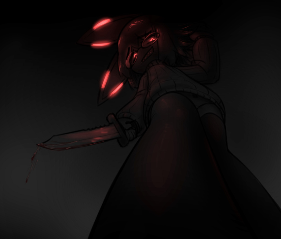 That's some crazy lighting work, the near darkness being illuminated almost entirely by her glowing eyes and ears is an awesome visual. It reflecting off the knife in particular while highlighting the blood (not to mention her grin) is wild. Definitely channeling Mercury energy here! The red version and the animation too, that's an even heavier impression with the flickering!