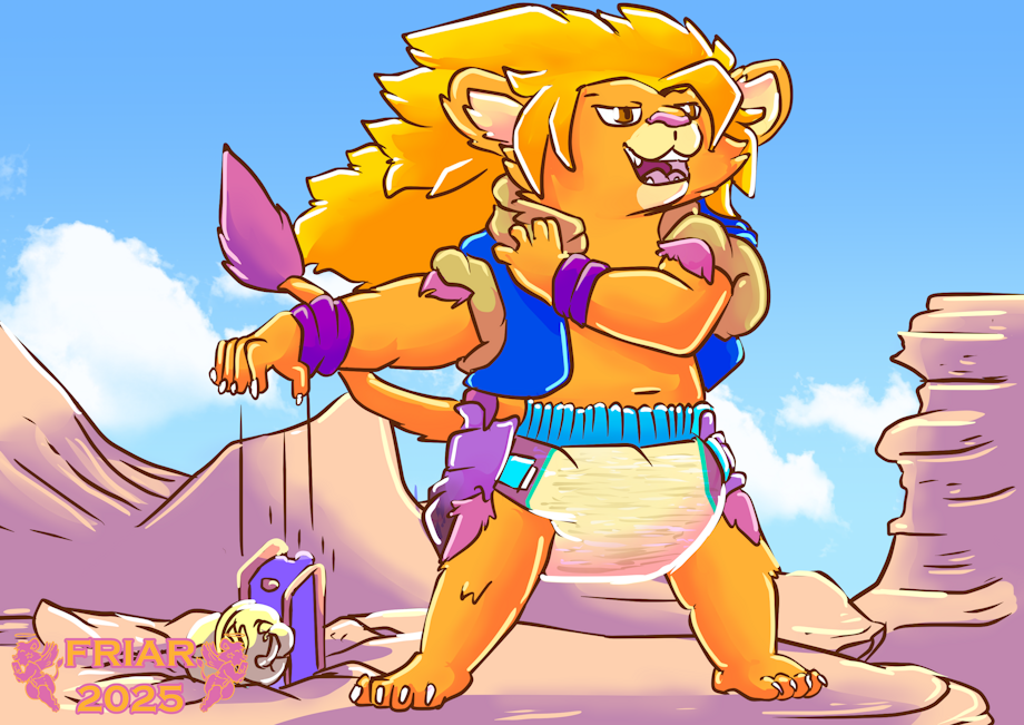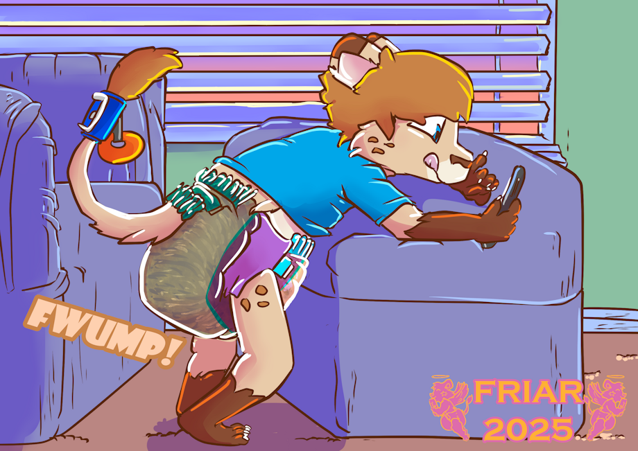 Illustration of Ozzy the wet and messy diapered two tailed fox playing guitar and pooping his diaper in Friar's bedroom, where he is learning the song Banana Head from the Banana Head album with Everett on the cover.