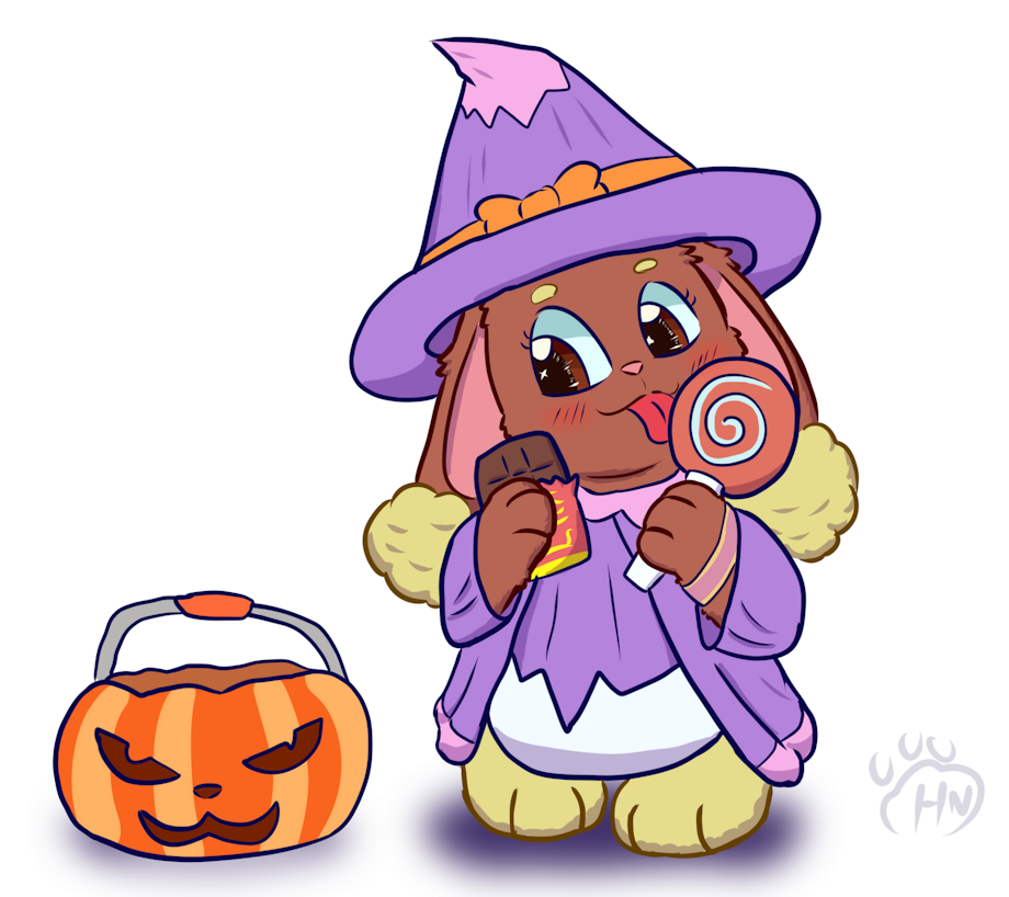 Little Dahlia in her Mismagius witch costume enjoying her Halloween candy. She's collected so many that her bucket could be considered a treasure chest.