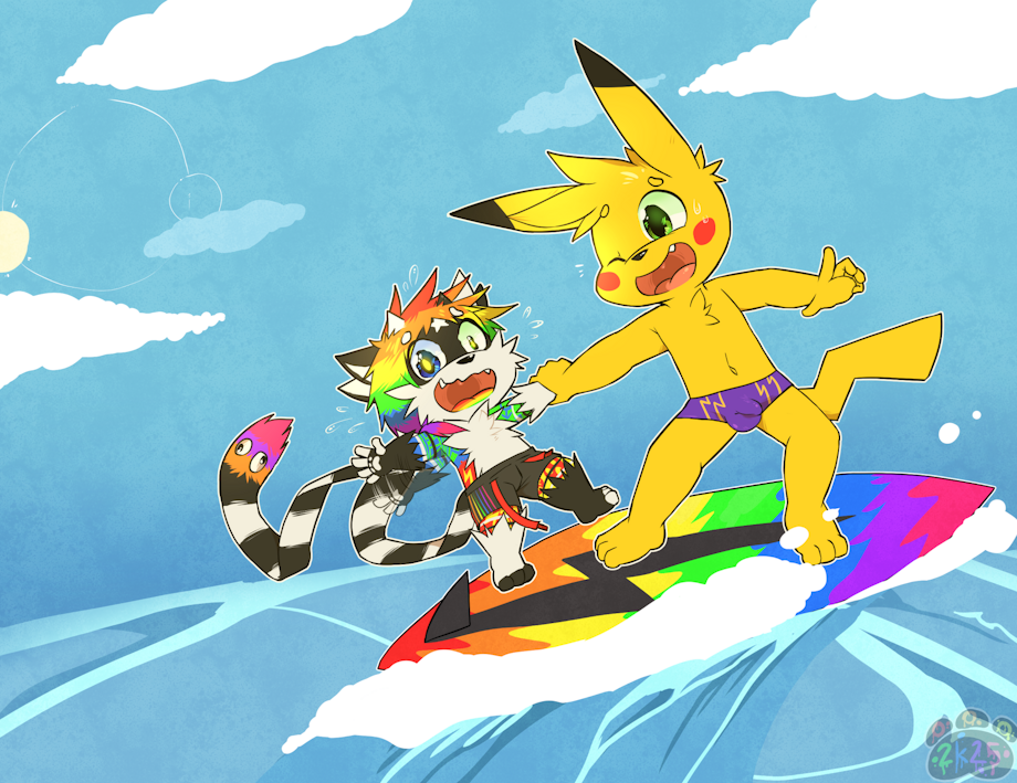 Ooo decided he wanted to try out surfing, so Error took him out for a few lessons. Ooo almost slipped off into the water, but a quick-acting chu saved the day! :3