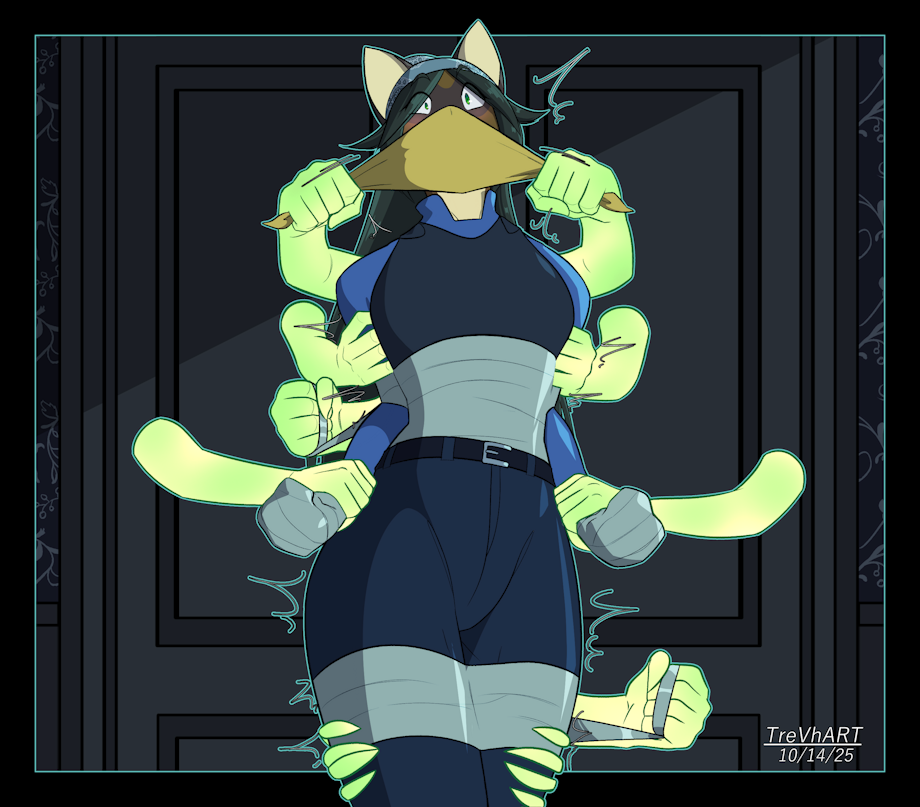 Before she could even touch the door, flashes of ghostly green swarmed the mustelid and within the blink of an eye, slender spectral hands had bound her in wraps of tape, gagged her with old scarves stuffed into and tied over her mouth. The creaking of the tape and the old wooden floor, or the mumbling of Faye’s quickly quietening cries for help might’ve attracted someone’s attention, but as things were they got drowned out by the music of the partygoers downstairs. The ghostly, feminine hands caressed their capture affectionately, before dragging her off into one of the rooms, away from prying eyes…