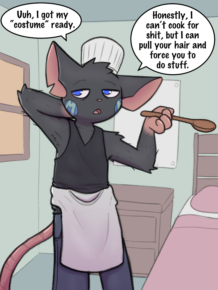 He couldn't be bothered to go get an actual apron x3 Glad you noticed that little detail~