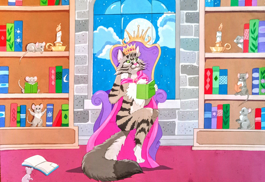 A royal kitty enjoying her books