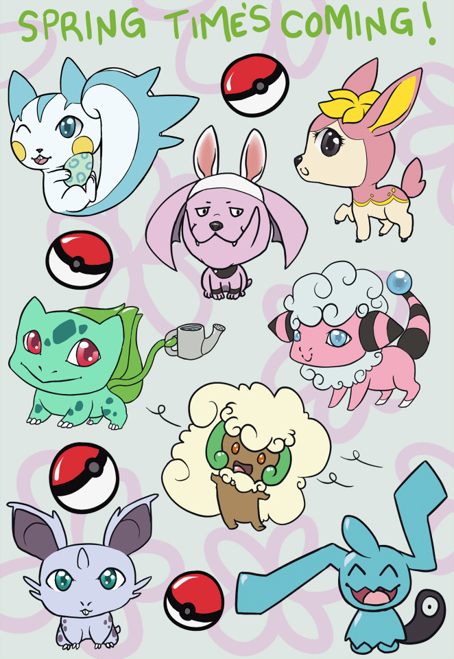 Spring is coming~ I doodled up this page that I'm thinking of making into stickers. It includes, a pachirisu with an easter egg, a granbull with bunny ears, a cute spring deerling, bulbasaur with watering can, Flaaffy, a whimsicott riding a draft, a nidoran F, and a wynaut... because... well why not?! (Haha see what I did there?) Along with a few Pokeballs.