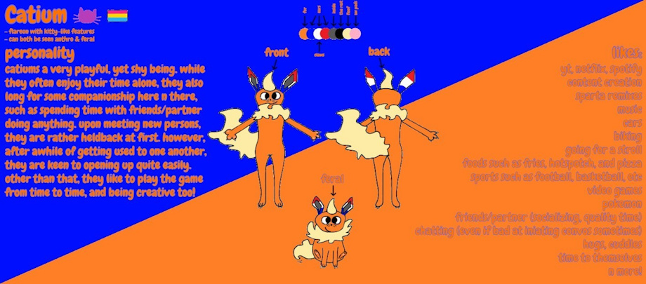 heres my ref sheet out of my flareon oc! about time i made one, i think. n yes, catiums my new alias! excuse the quality, which is why ill list the words above for further clarification (from left to right): fur, ears, inside (ears), the rest (eyes, outlining, etc), floof, and paw pads. also, this is the last art i made on windows, right before i moved onto linux. because of this, expect somewhat of a difference in my upcoming arts, but shouldnt be too big of a thing, just gotta get used to it n all (been working on it already)