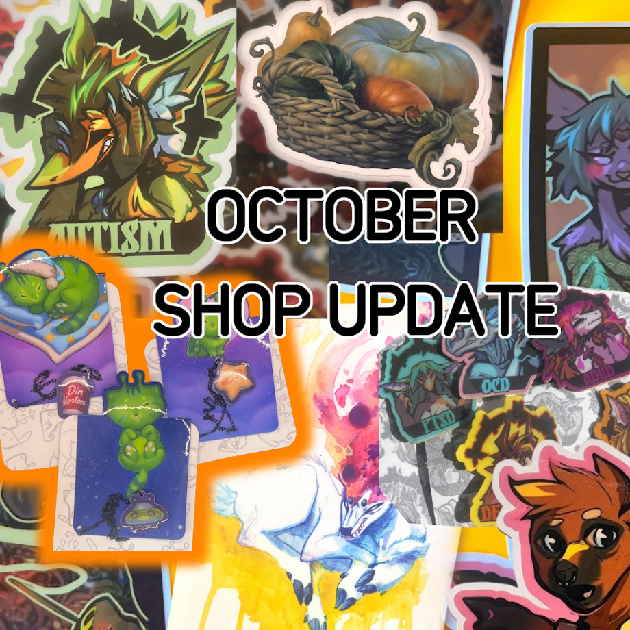 October/September update - with pins and bookmarks! 1 new art print, 5 bookmarks, 15 new stickers, and 6 pins :3 Check it out!
