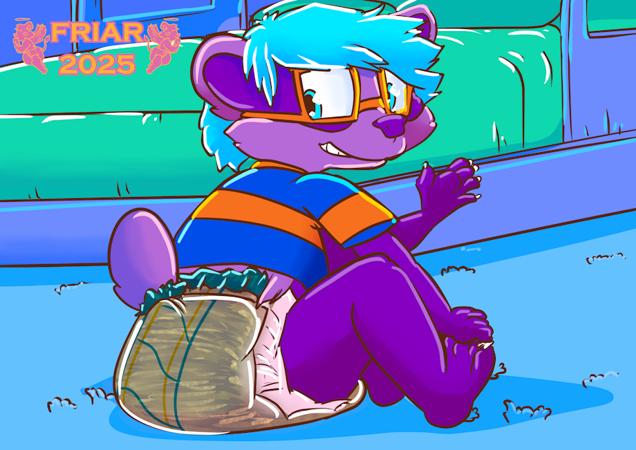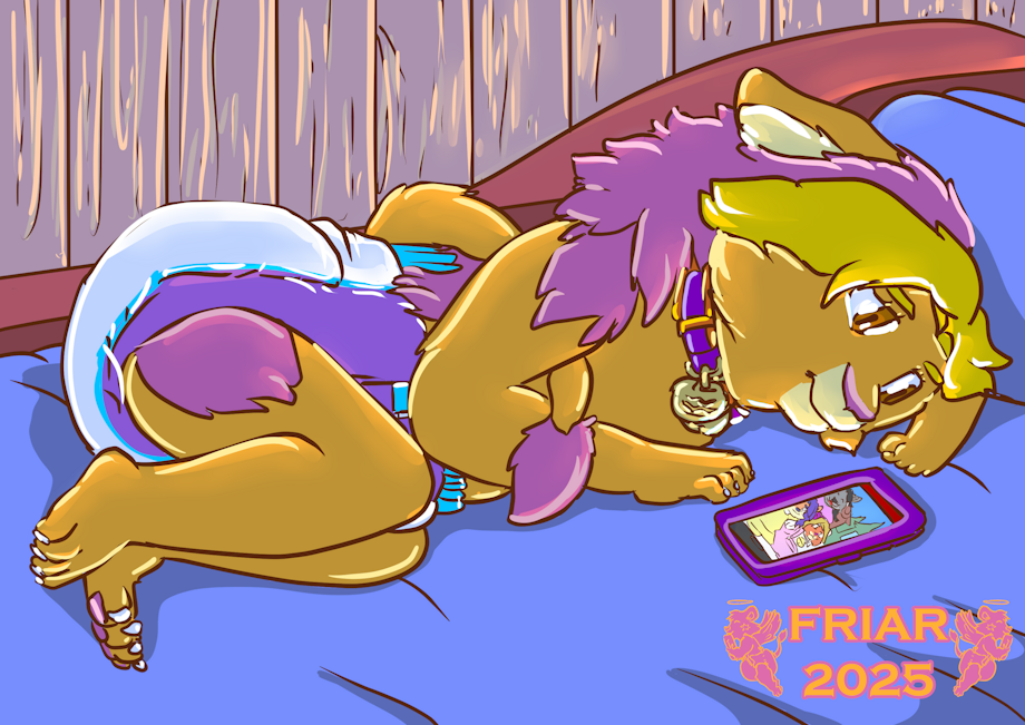 Illustration of Friar the wet and messy diapered lion laying on his side in his bed while longingly looking at his phone with the red tape over the camera, where a picture of Mama Zephie, Alfador and Friar is displayed.